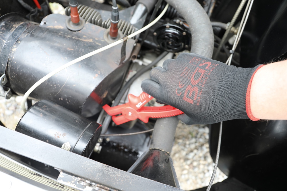 - farba: signálna červená, prevencia zabudnutia v motorovom priestore