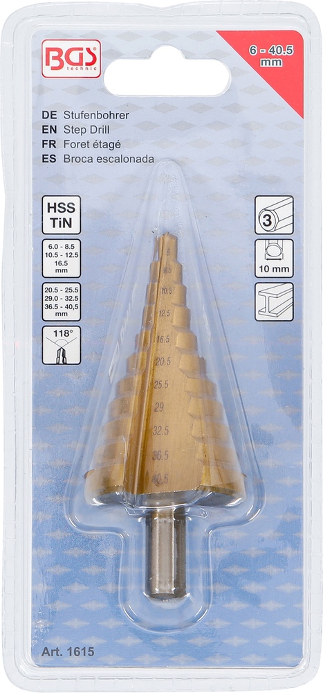 Vrták stupňovitý, nitrid titánu, Ø 6 – 40,5 mm, BGS 1615