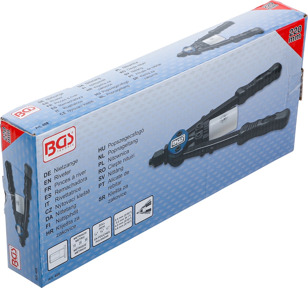 Kliešte nitovacie, dlhé rameno, so zbernou nádobkou, BGS 409