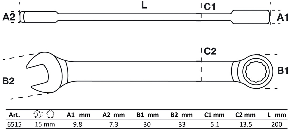 Kľúč očkoplochý račňový, 15 mm, BGS 6515