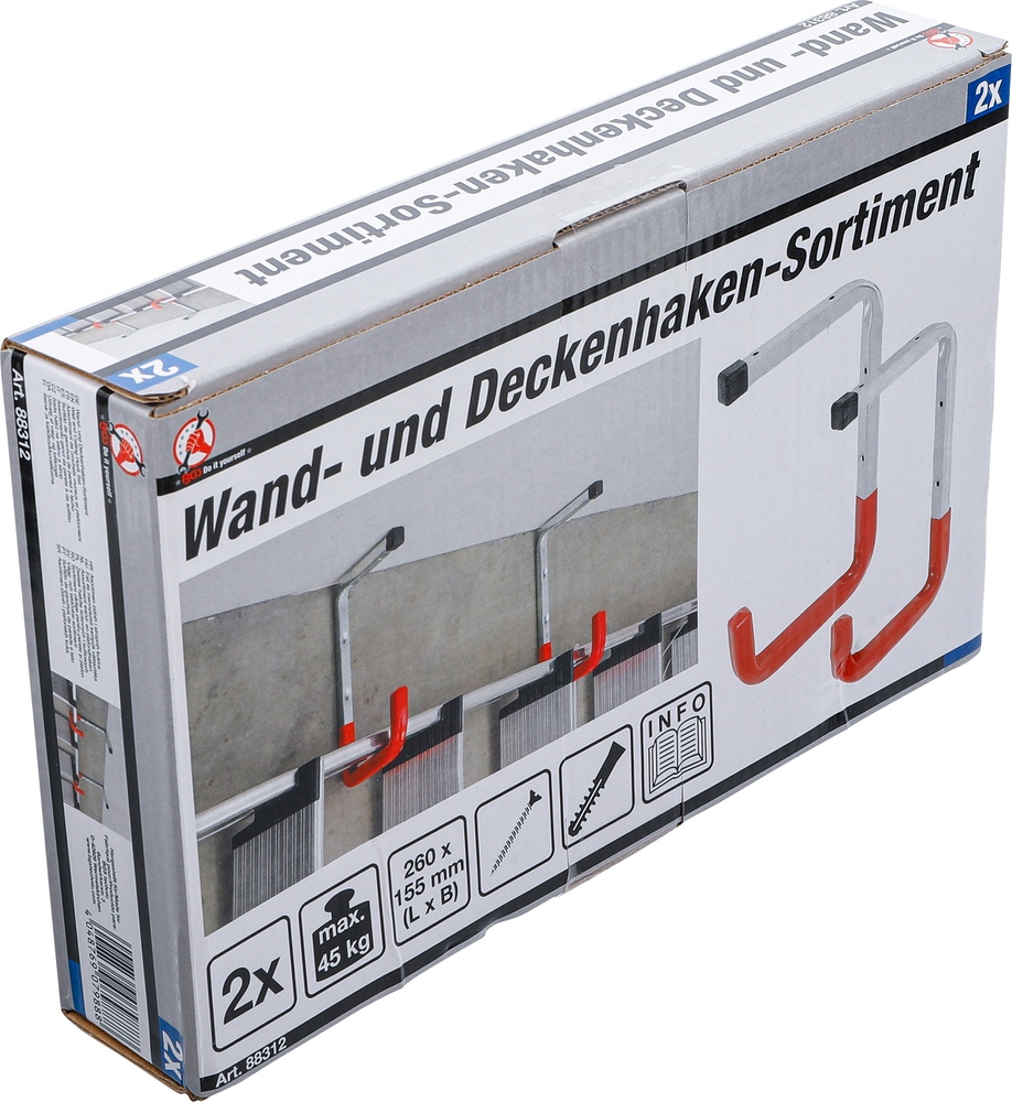 - 2 háky do steny a stropu, 260 x 155 mm, max. nosnosť 45 kg