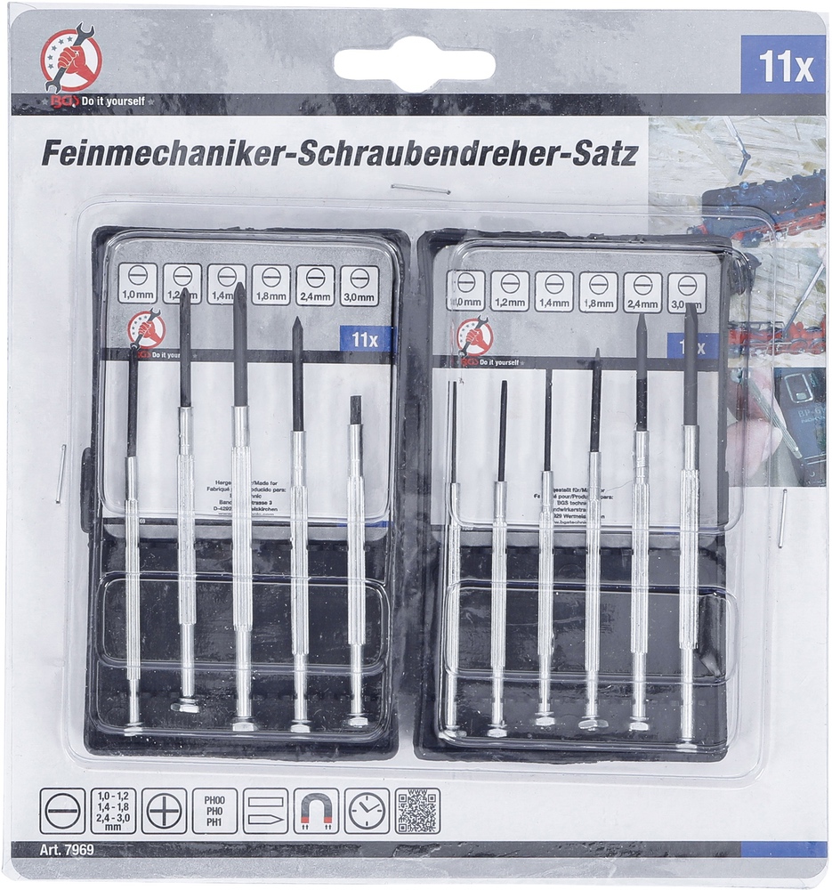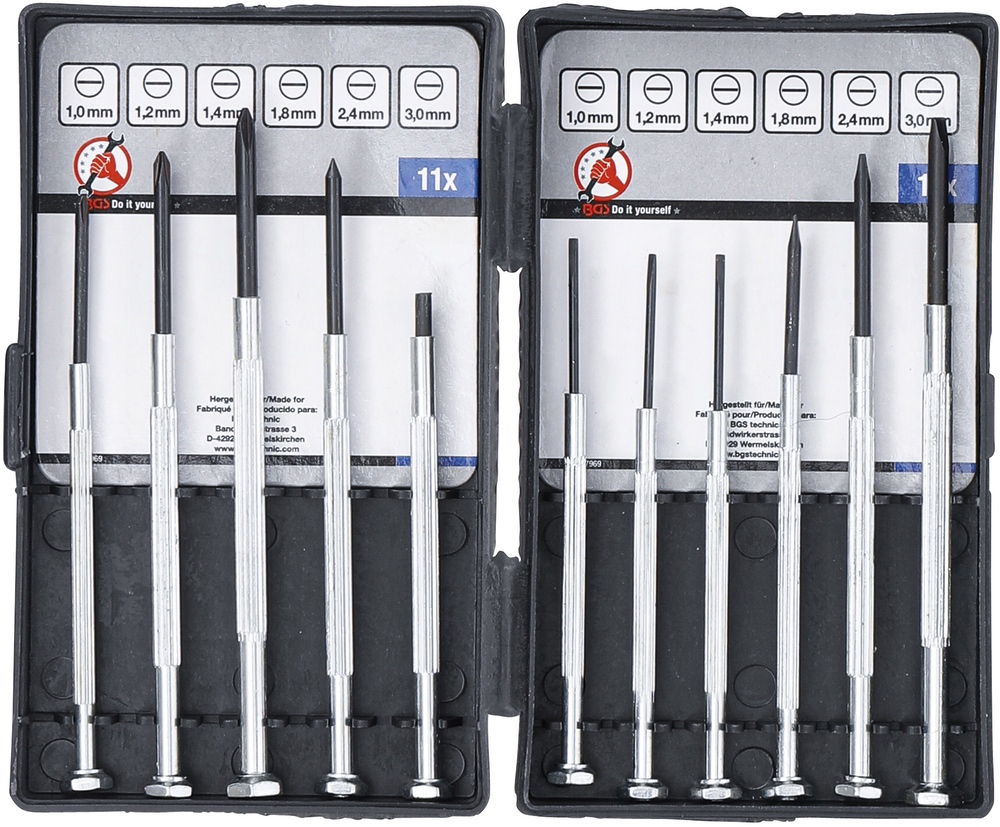 Skrutkovače hodinárske, ploché SL 1 – 3 mm, PH00 – PH1, 11 dielov, BGS 7969