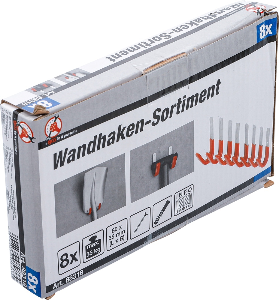 - 8 nástenných hákov, 80 x 35 mm, max. nosnosť 35 kg