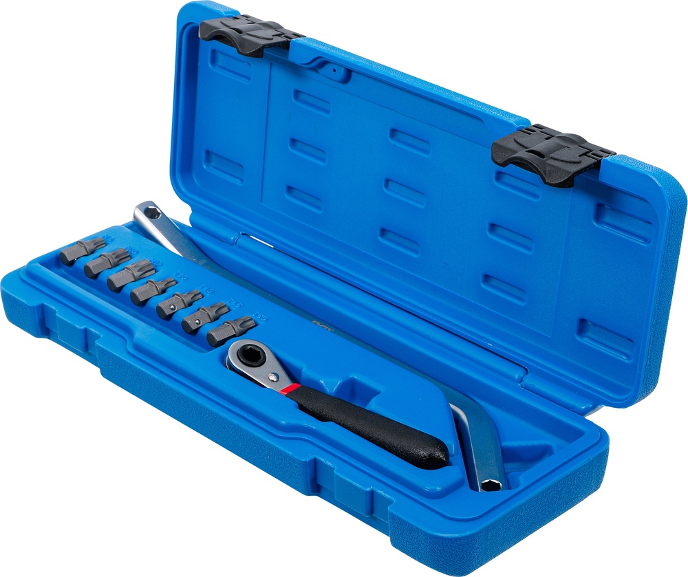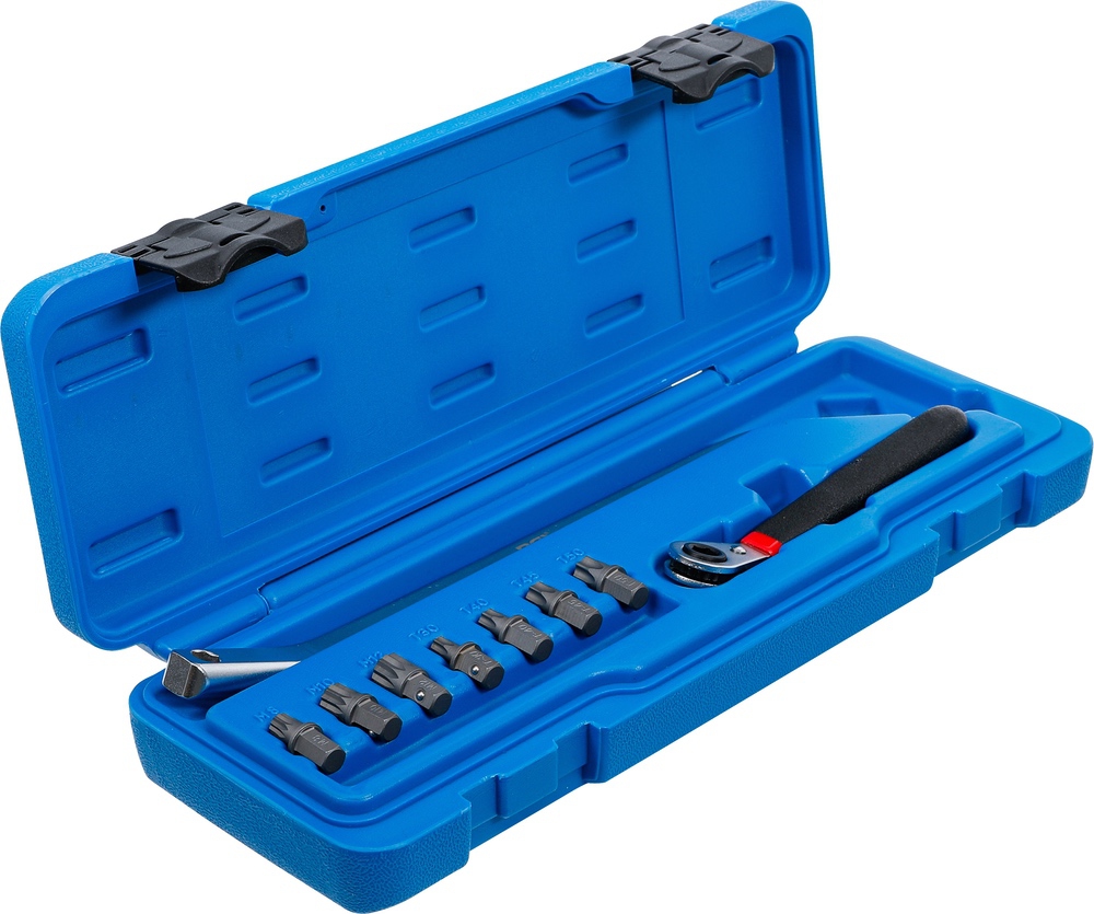 - obsahuje nasledujúce nástrčné hlavice s pridržiavacou guličkou pre skrutky s vnútorným tisíchranom M8, M10 a M12 a skrutky s profilom T T30, T40, T45 hlavica s dvoma rôznymi uhlami zalomenia
