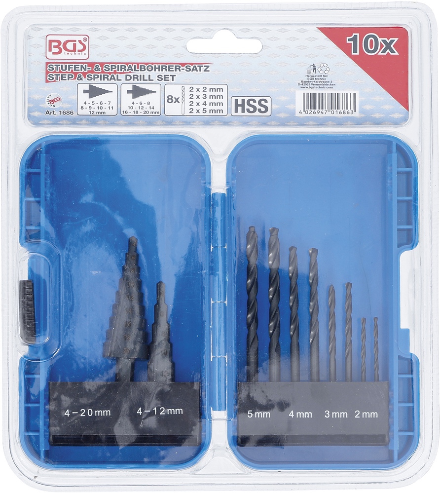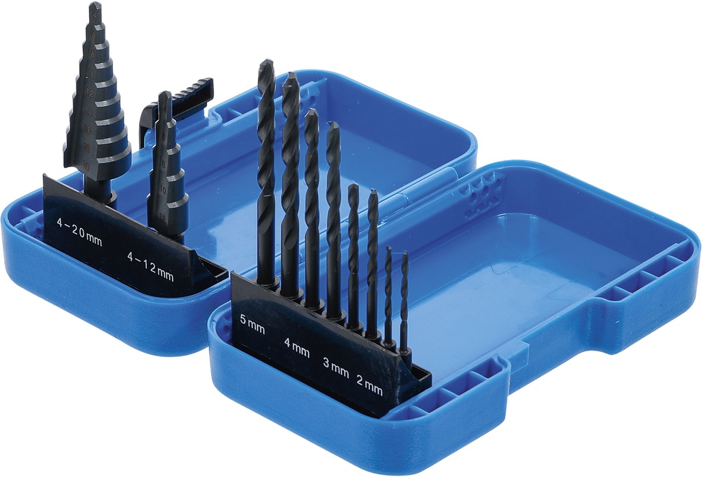 Vrtáky stupňovité, špirálové, Ø 4 – 12 / 4 – 20 mm, 2 – 5 mm, 10 dielov