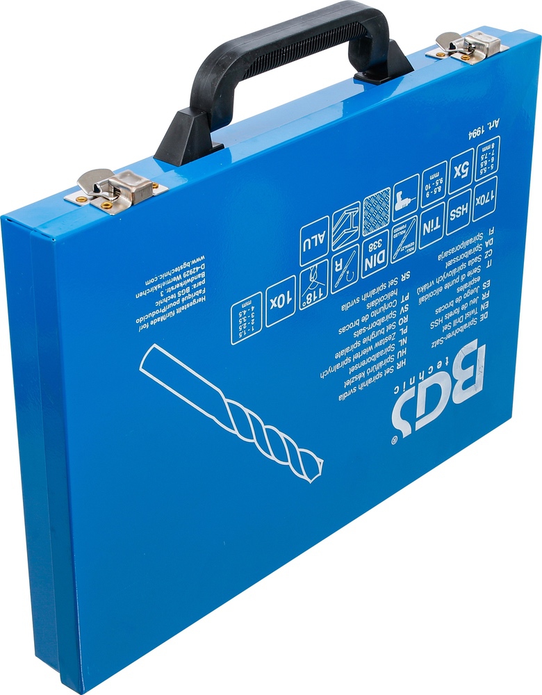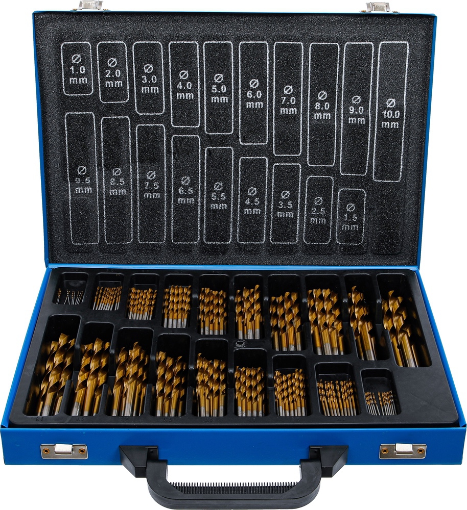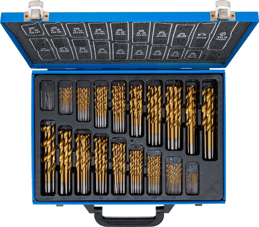 - vždy 10 špirálových vrtákov Ø 1,0-8,0 mm, postupne po 0,5/5 vrtákov Ø 8,5-10,0 mm, postupne po 0,5 mm