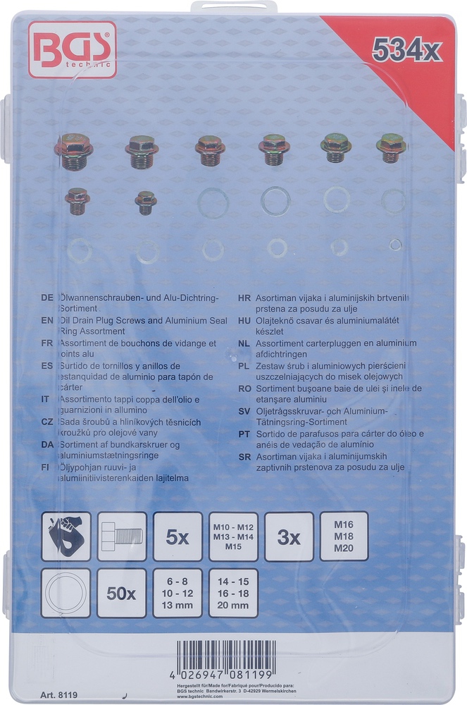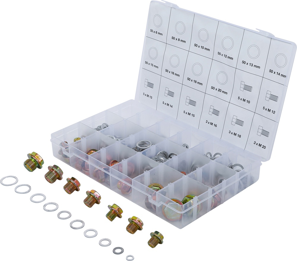 Skrutky na olejové výpuste a hliníkové tesniace krúžky, 534 dielov, BGS 8119