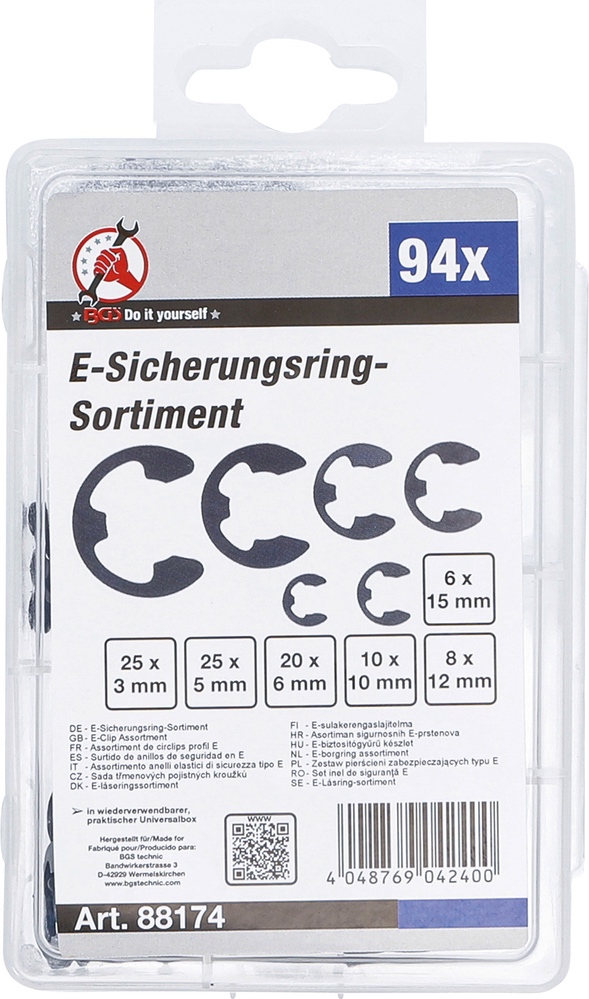 Krúžky poistné, strmeňové, 3 – 15 mm, 94 dielov BGS 88174