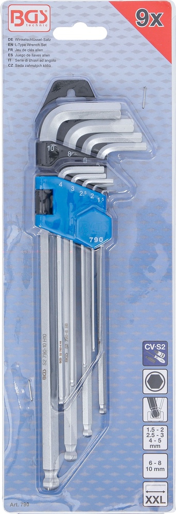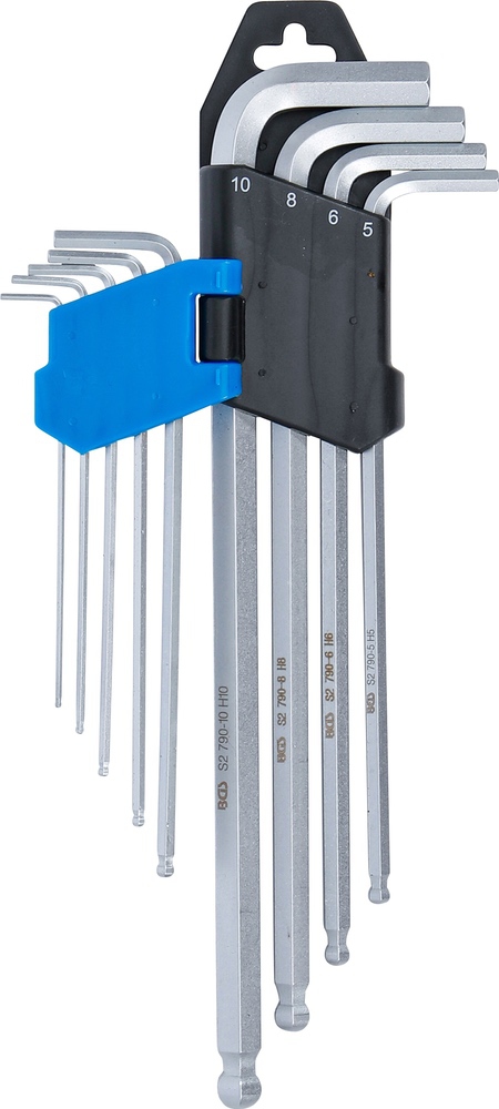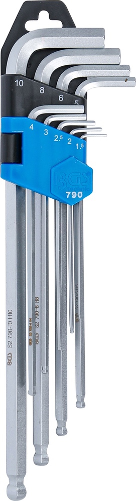 Kľúče L, extra dlhé, imbus / imbus s guľou, 1,5 – 10 mm, oceľ S2, 9 dielov, BGS 790