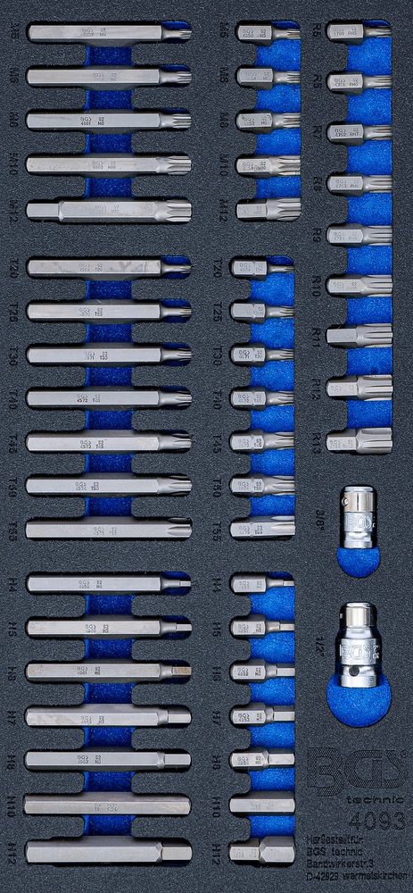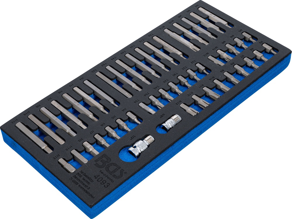 - 14 nástrčných hlavíc, krátke a dlhé prevedenie, pohon vonkajší šesťhran 10 mm (3/8″), výstup vnútorný šesťhran: 4 – 5 – 6 – 7 – 8 – 10 – 14 mm dlhé, a dlhé prevedenie vonkajší šesťhran 10 mm (3/8″), výstup T-profil (pre Torx): T20 – T25 – T30 – T40 – T45 – T50 – T55