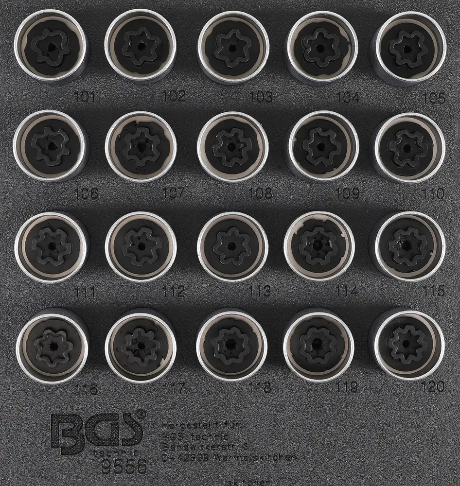 - 20 nástrčných hlavíc na bezpečnostné skrutky kolies o veľkosti: