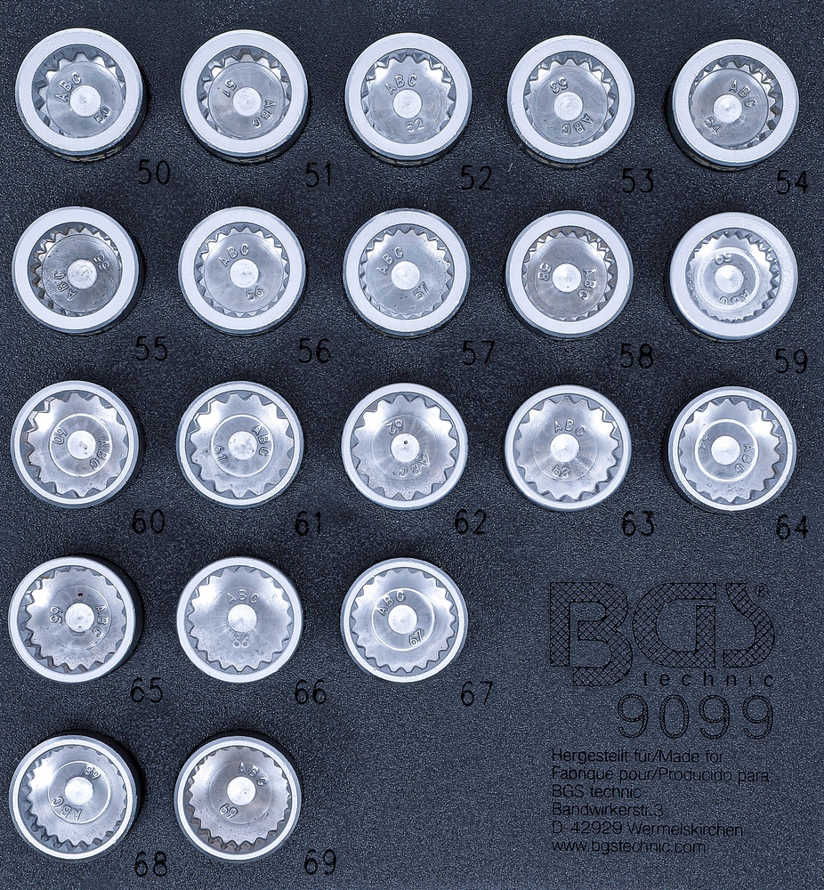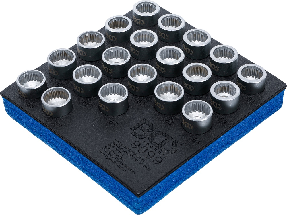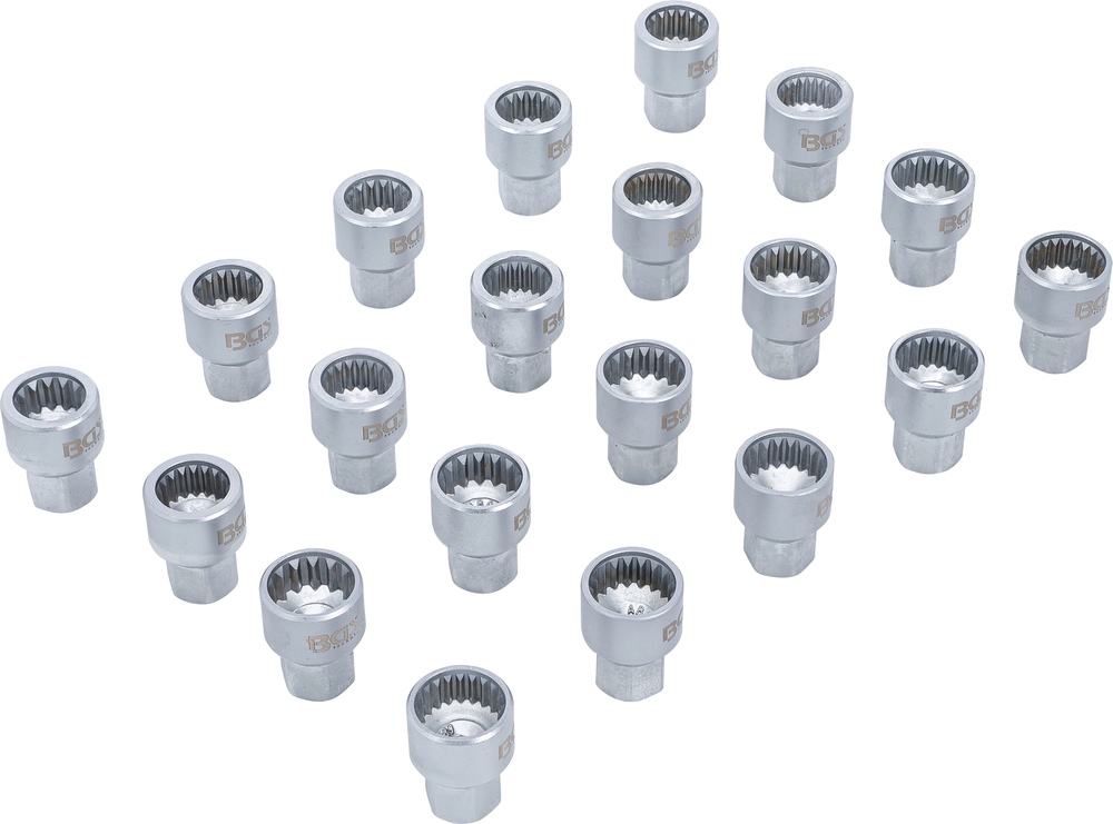 - 20 nástrčných hlavíc na bezpečnostné skrutky kolies nasledujúcich veľkostí: #50x14hran – #51x15hran – #52x15hran – #52x15hran – #52x15hran – #52x15hran – #52x15hran #55x19hran – #56x20hran – #57x21hran – #58x22hran – #59x23hran – #60x14hran – #61x15hran – #62x16hran – #63x17hran – #64x18hran – #65x19hran – #65x19hran #68x22hran – #69x23hran